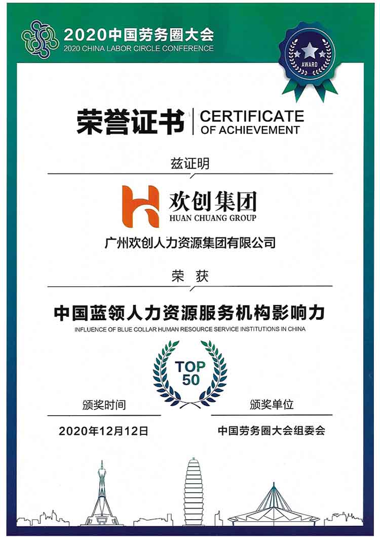 歡創(chuàng)集團(tuán)榮獲中國藍(lán)領(lǐng)人力資源服務(wù)機(jī)構(gòu)影響力TOP50證書